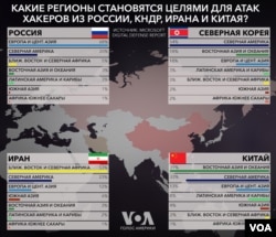 В двух других регионах наибольшее влияние хакеров сосредоточено на странах, находящихся в состоянии военных конфликтов: